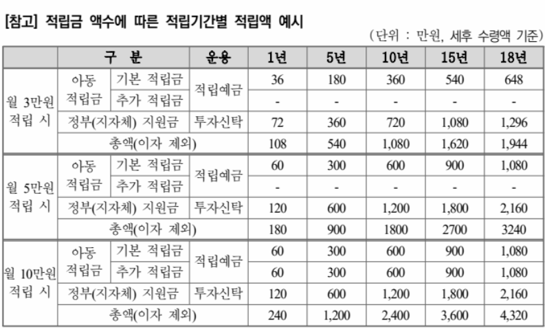 표를 보면 아시다시피, 아동의 기본 적립금의 2배를 정부지원금으로 투자신탁에 적립됩니다.