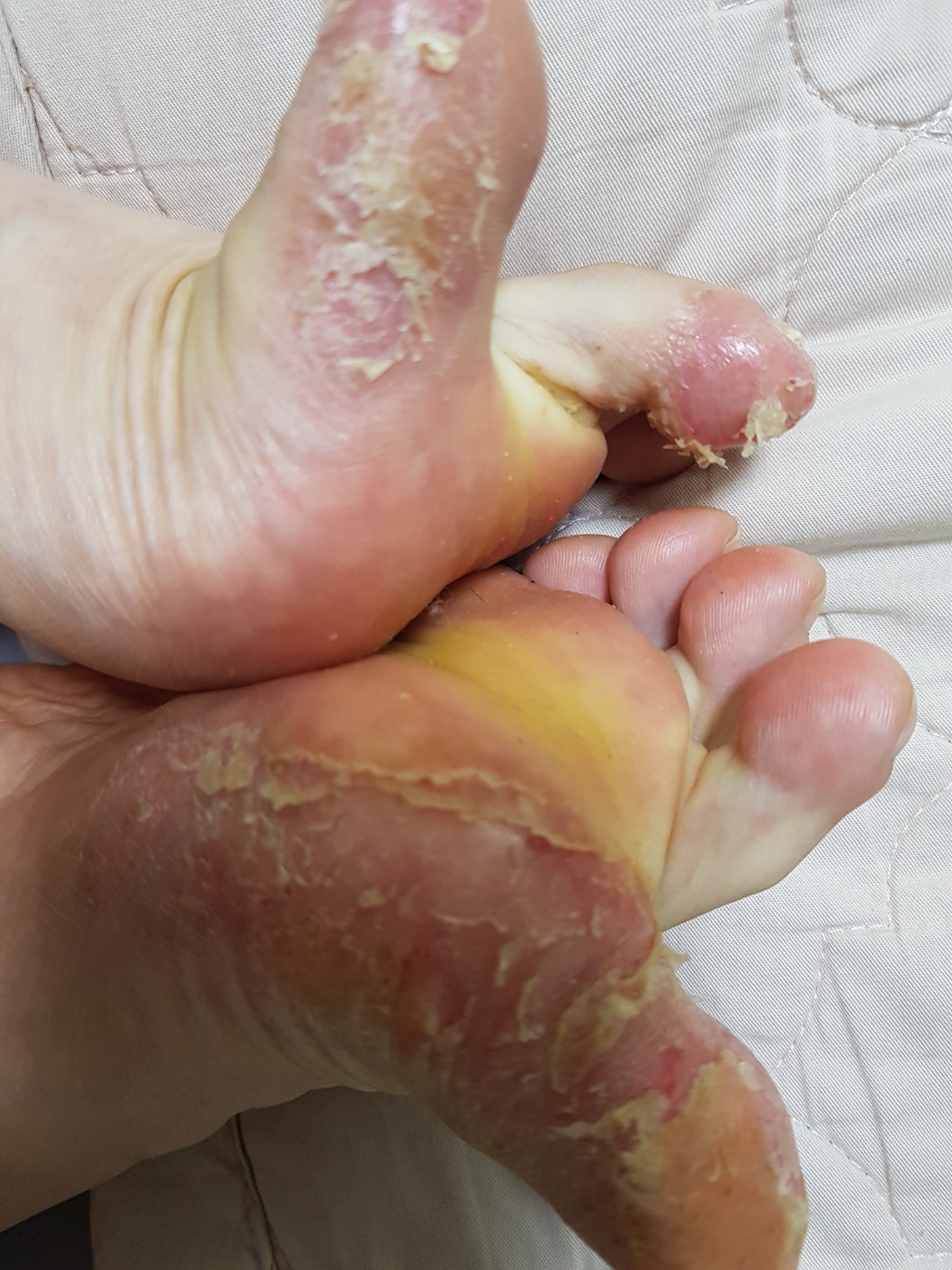 결국은, 좁쌀 같은 수포가 한두 개 있던 것이 손가락마다 전부 퍼지고, 발가락에도 생깁니다.
