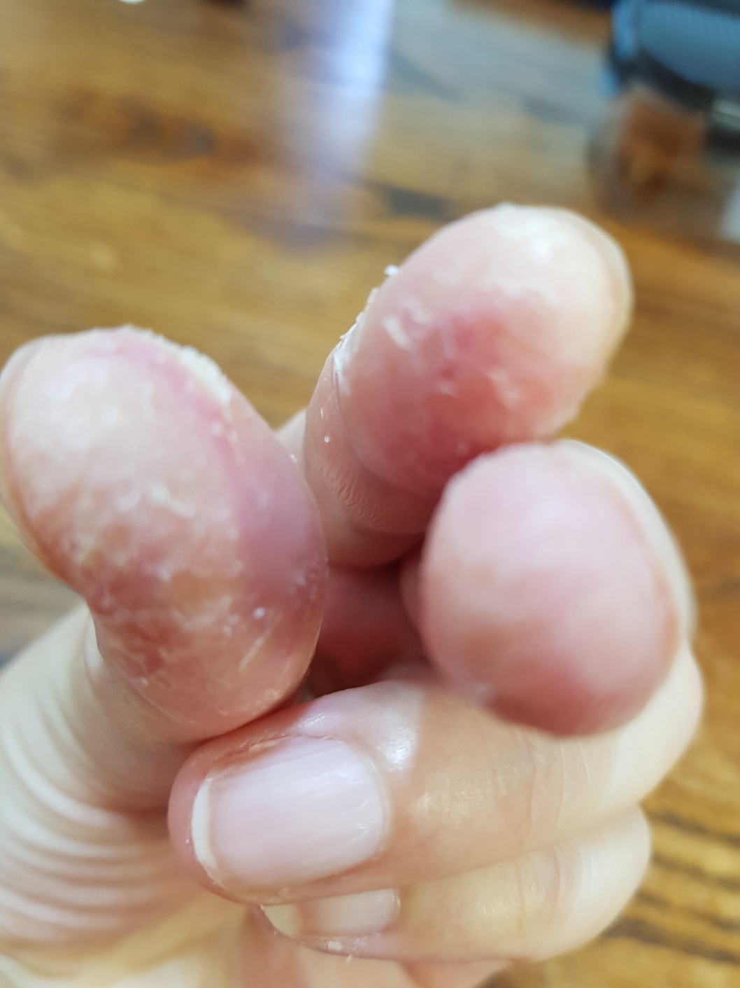 더 늦으면 안 될듯하여 병원에 갔습니다. "항스타민제"와 "스테로이드"를 처방받고 일순간 뛰어난 효능에 감탄을 하게 됩니다. 하지만 그다음 날이면 다시 시작되고, 그 다음날엔 조금 더 퍼졌습니다. 그러면 약을 먹고, 다시 리바운드 현상으로 상황이 점점 심해졌습니다. 결국엔 빨래를 갤 때도 위생 장갑을 껴야 했습니다. 왜냐고요? 살이 다 거스러미처럼 올라오고 갈라졌기 때문입니다. 속살이 보이는 곳도 있으니 옷감이 스칠 때마다 너무 쓰라렸습니다.