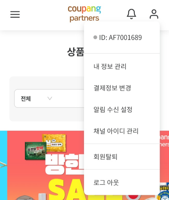 쿠팡파트너스로 돌아가서~ 첫 화면의 사람 모양 누르면 A로 시작하는 ID가 있어요.