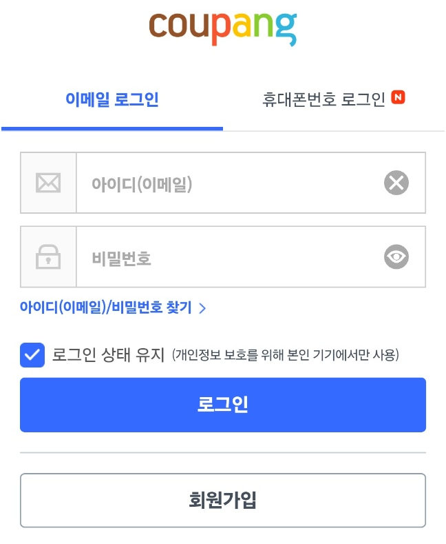 쿠팡계정에 사용된 이메일과 비밀번호를 입력 후 회원가입을 누릅니다.