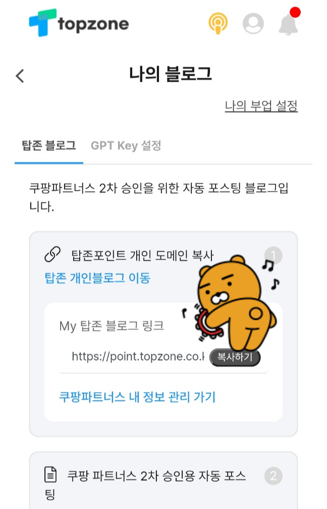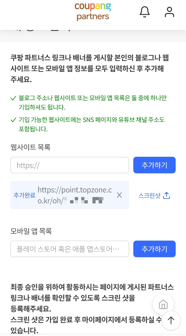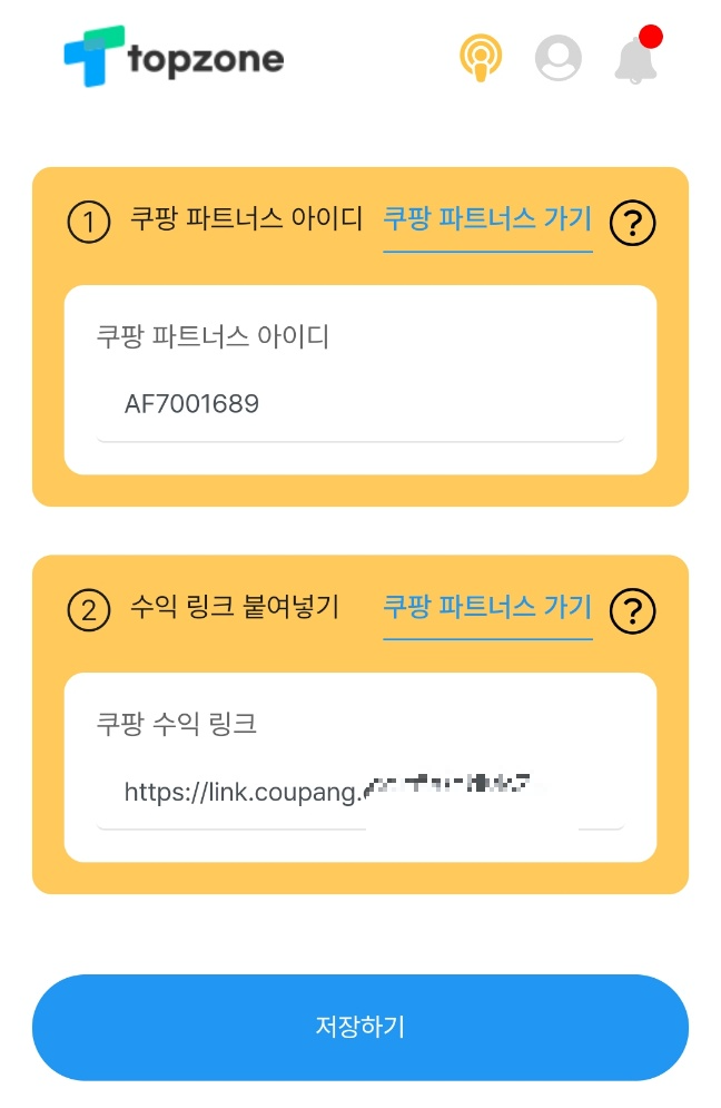 3. 탑존포인트에 쿠팡파트너스 ID와 블로그 주소 연동시키기