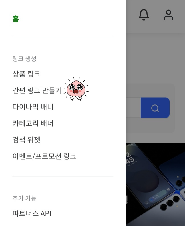 2) 쿠팡파트너스로 돌아가서 왼쪽 3선을 누른 후, 간편 링크 만들기를 선택합니다.