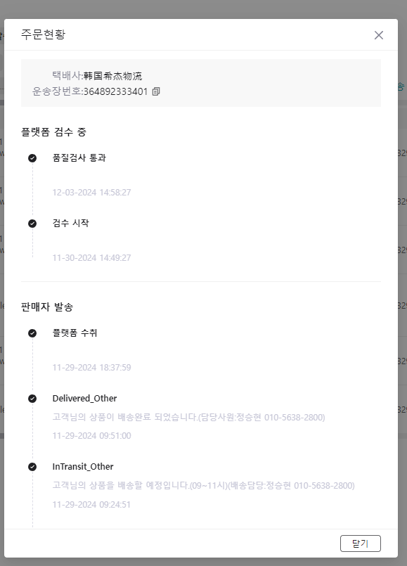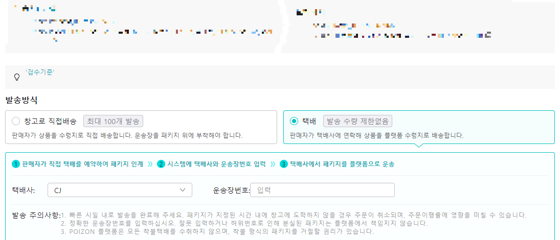택배 -> 택배사, 운송장 번호를 입력합니다.