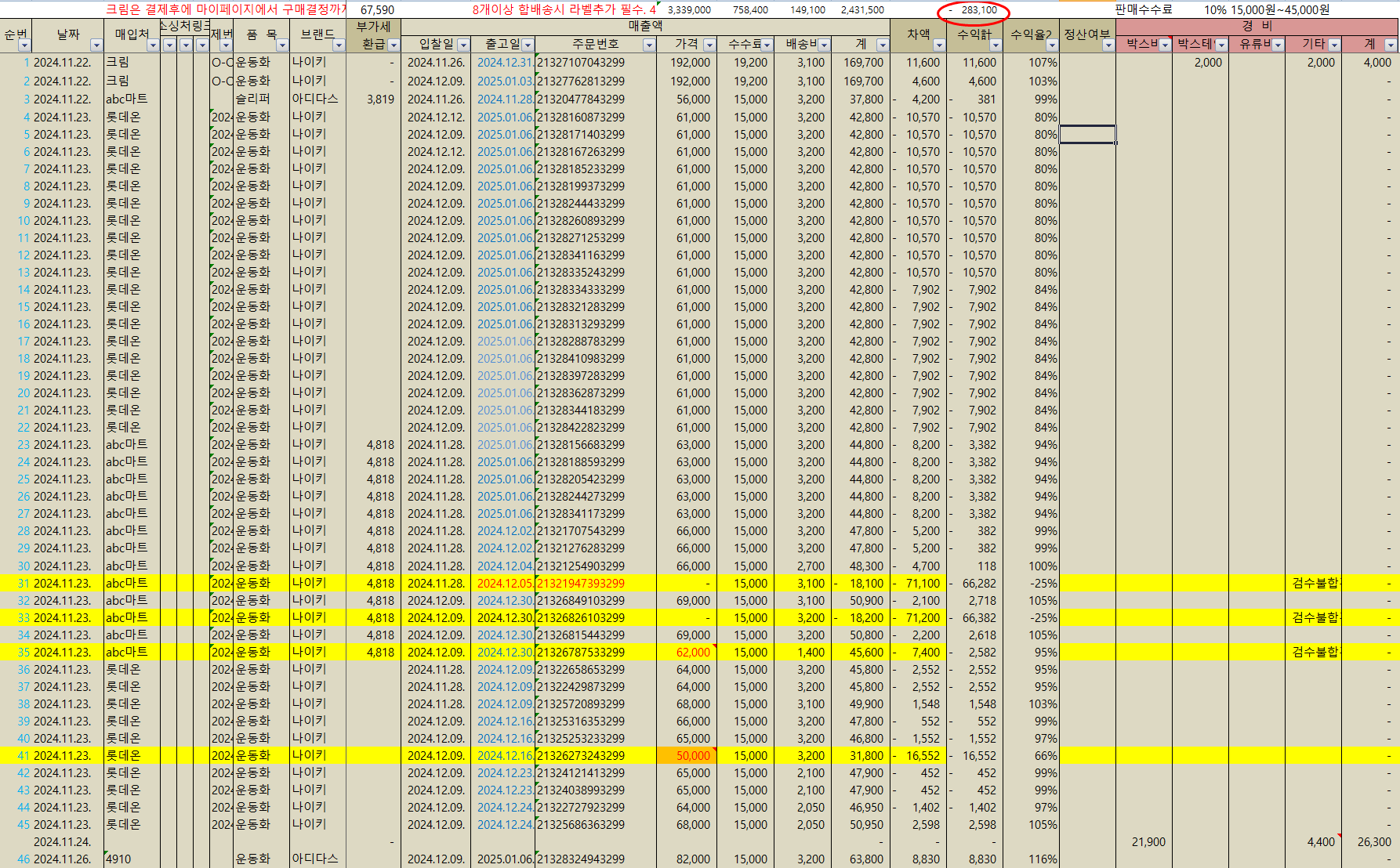반품 손실 포함해서 손실 -283,100원이 나옵니다.