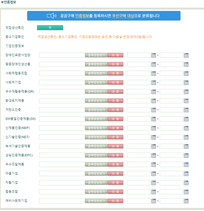 위 학교장터 사진에서 보다시피, 직접생산확인서와 중소기업확인서는 업로드 할 수 없습니다.